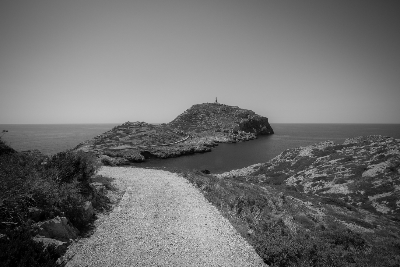 The lighthouse is located next to a cliff on the island of Cabrera. It was built in 1857 according to a project by engineer Emili Pou.
